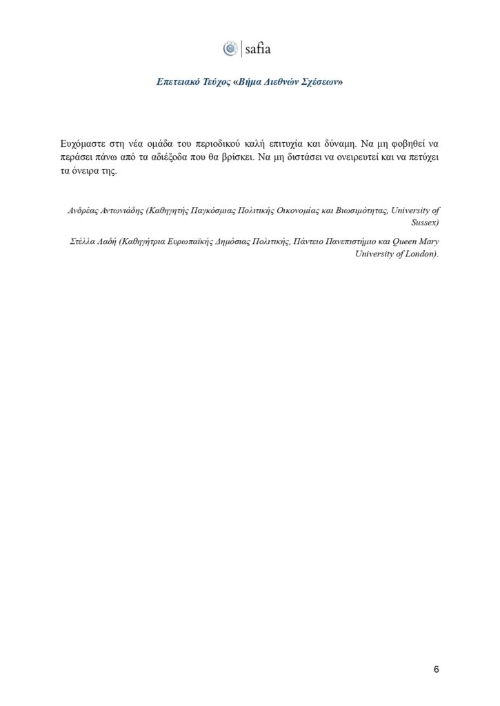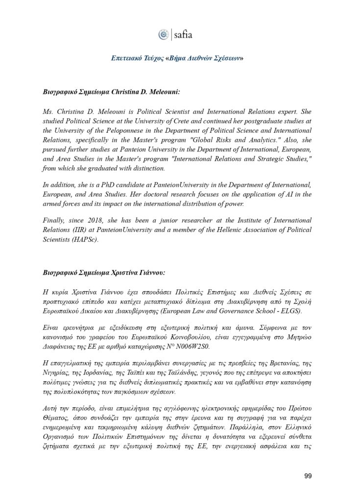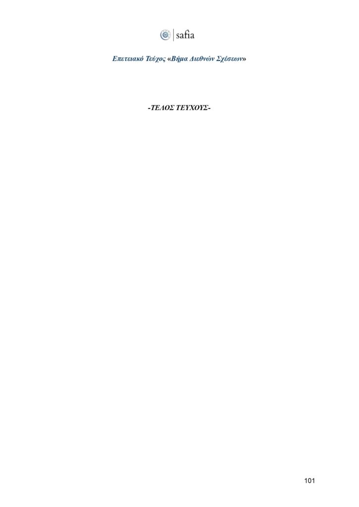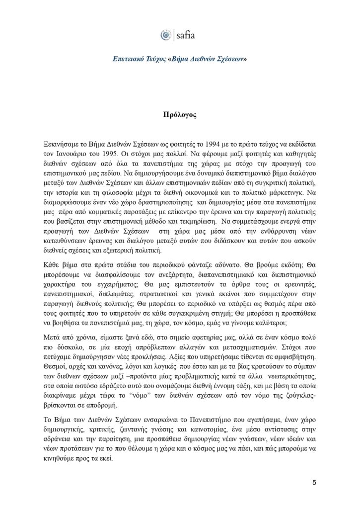 Στο πλαίσιο αυτής της ιστορικής επετείου, έχουμε τη χαρά να παρουσιάσουμε το επετειακό τεύχος του «Βήματος Διεθνών Σχέσεων». Μια επιστημονική έκδοση που φιλοξενεί κείμενα έγκριτων ακαδημαϊκών, αναδεικνύοντας καίριες θεματικές της διεθνούς πολιτικής, με στόχο να εμπλουτίσει τον δημόσιο διάλογο και να ενδυναμώσει τη φωνή των νέων ερευνητών.